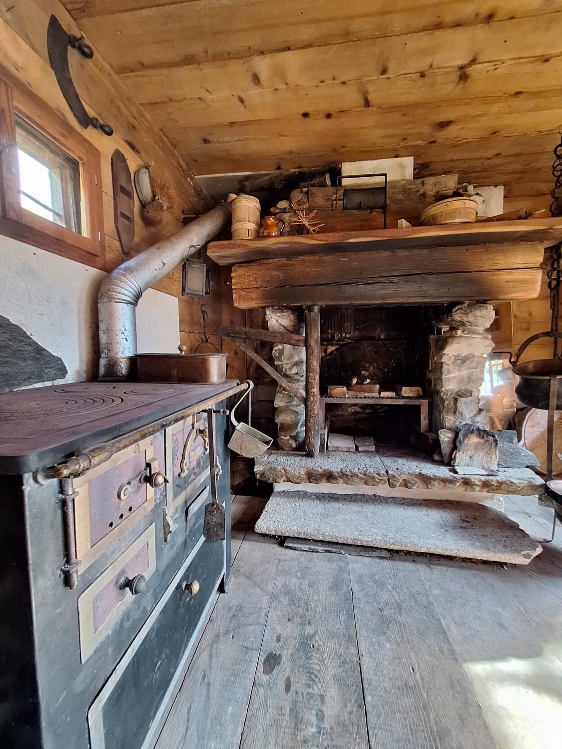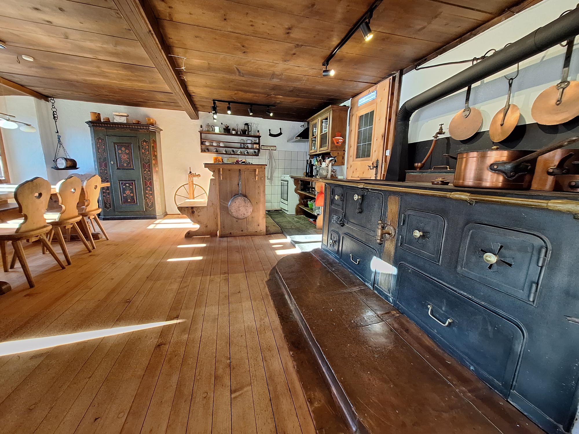 Ehemaliger Stall an der Via Sbrinz, heute ein stimmungsvoller Raum mit Natursteinboden aus dem Val Fex, Bodenheizung, offener Küche und Kamin. Im Sommer angenehm kühl, im Winter wohlig warm.